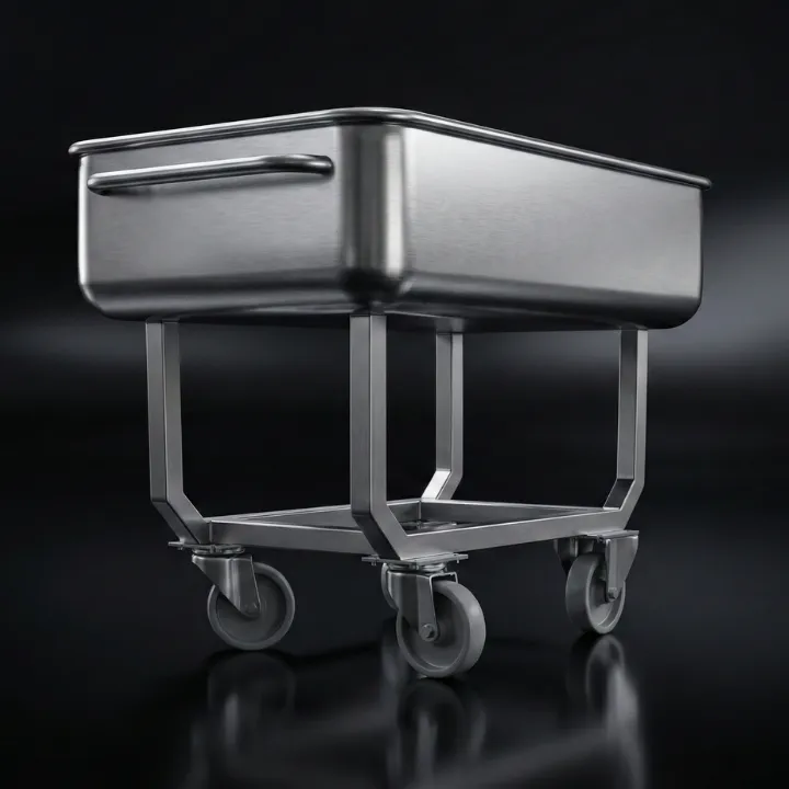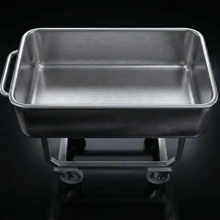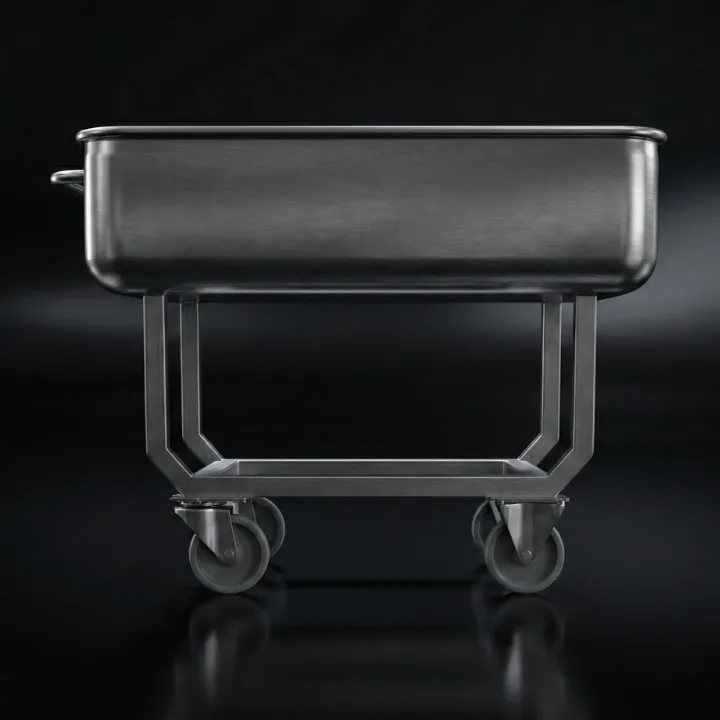 A professional 150L trough vehicle manufactured from stainless steel, featuring a fully electropolished surface and a heavily reinforced bottom, designed for the most demanding tasks in the food industry.